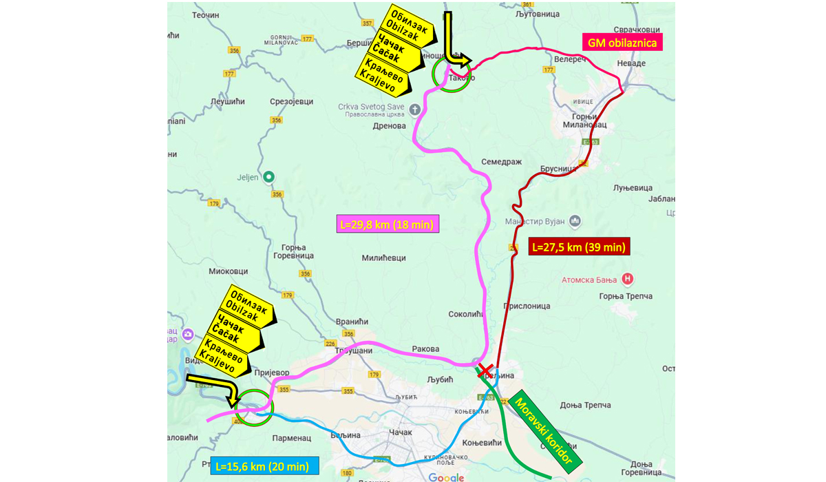 • For users going from the direction of Požega to Čačak / Kraljevo, the following route will apply: state road IA Category (A2) → turn off at the uneven intersection "Pakovraće" → state road IB Category No 23 and further state road I B Category No 22, i.e. Pakovraće - Čačak - Preljina - Kraljevo