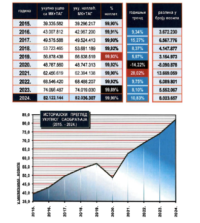 The Sector also pays special attention to sustained regional development, which is confirmed by the selection and realization of projects out of the network of future TEN network, but recognized by the Serbian Government as very important for sustained regional development, such as road routes: Iverak – Lajkovac, Kuzmin – Sremska Rača, Belgrade – Obrenovac, Batočina – Kragujevac – Mrčajevci, Ruma – Šabac – Loznica, Bački Breg – Sombor – Kula – Kikinda – Nakovo, Požarevac – Veliko Gradište – Golubac – Donji Milanovac – Brza Palanka – Kladovo – Negotin, bridge over the Danube River at Bačka Palanka, and bridge over the river Velika Morava at Ćuprija. The fact that we are on the right track is supported by data on increase in total traffic volume in the previous period as of 2015 when 39,335,582 vehicles passed through the tolling system to 82,122,144 vehicles in 2024.