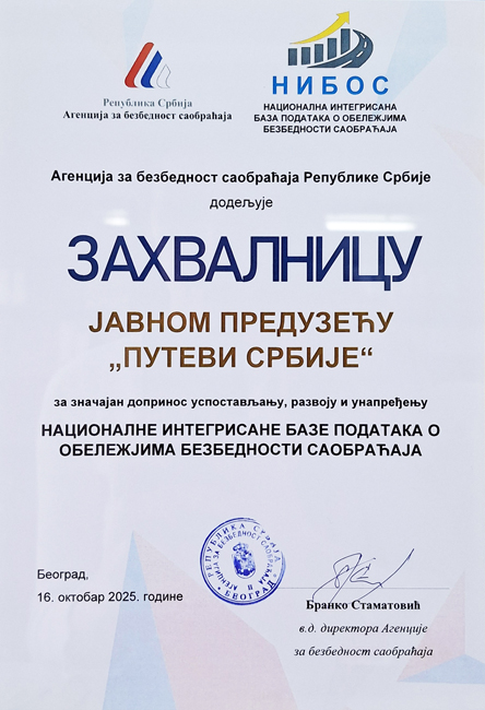 Na svečanom obeležavanju decenije uspešnog funkcionisanja Nacionalne integrisane baze podataka o obeležjima bezbednosti saobraćaja (NIBOS) održanom 16. oktobra 2025.g. Agencija za bezbednost saobraćaja je dodelila zahvalnicu JP „Putevi Srbije“.